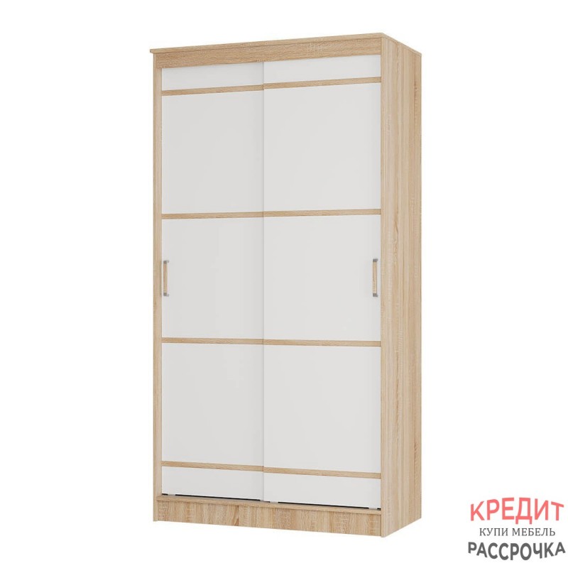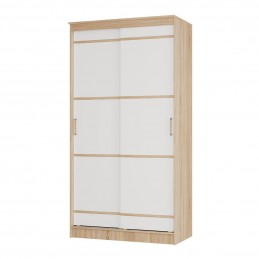Шкаф-купе "Сакура" выполнен в едином стиле с остальными модулями одноимённой мебельной серии. Он сделан из ЛДСП высокого качества в комбинации цветов "сонома" и "белый", раздвижные дверцы декорированы темными полосами и дополнены удобными ручками. Внутри модель содержит все необходимые зоны для хранения одежды и обуви: отделение для плечиков, а также полки и ниши для остальных вещей.