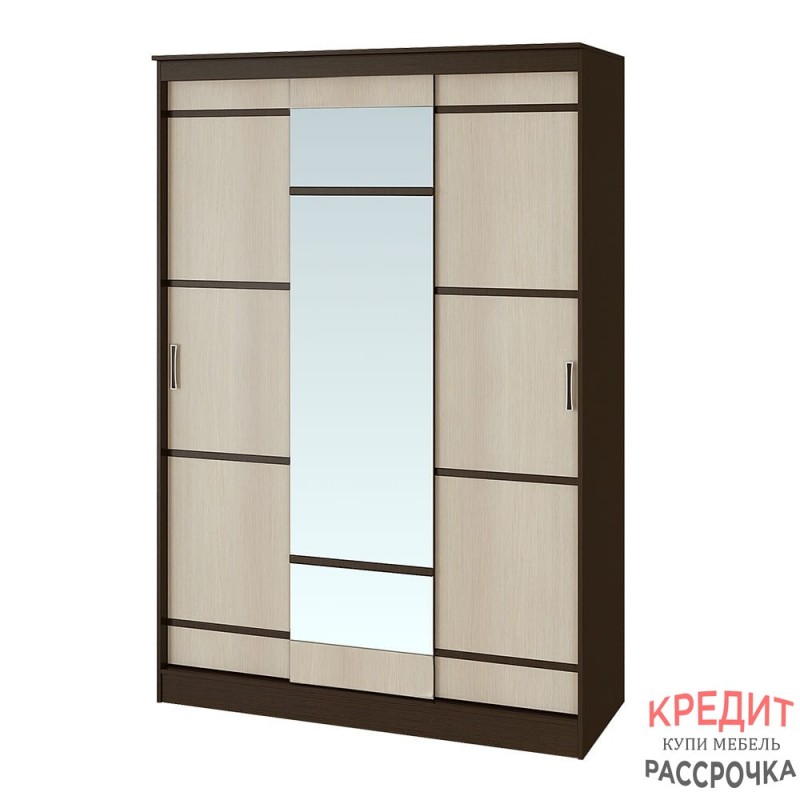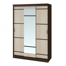 Шкаф-купе "Сакура" выполнен в едином стиле с остальными модулями одноимённой мебельной серии. Он сделан из ЛДСП высокого качества в комбинации цветов "венге" и "лоредо", раздвижные дверцы декорированы темными полосами и дополнены удобными ручками, центральная створка – полностью зеркальная. Внутри модель содержит все необходимые зоны для хранения одежды и обуви: большое отделение для плечиков, а также полки и ниши для остальных вещей.