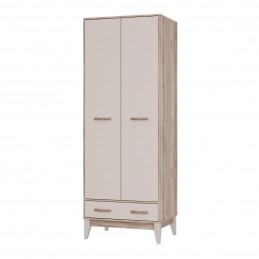 Двухстворчатый шкаф «Скандика» выполнен из качественной ЛДСП в оттенках "дуб смоки/кашемир". Матовые фасады практичны в использовании. Модель состоит из нижнего выкатного ящика, двух распашных дверок, за которыми находится отделение с хромированной штангой, вместительная верхняя полка и встроенный блок с двумя дополнительными полками.