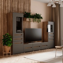 Модульная коллекция «Наоми» в декоре F24 – это стильное современное решение в контрастном сочетании корпуса «дуб каньон» с элегантным матовым фасадом насыщенного грифельного оттенка. Подобное сочетание цветов даёт полное основание коллекции стать хитом интерьера Вашей квартиры. Уникальная геометрия фрезерованных фасадов полностью отвечает опирающемуся на принципы минимализма духу времени и великолепно реализует свой выразительный потенциал в любом стилистическом формате; оригинальное конструктивное решение коллекции – ручки фасадов, выполненные путем сложной фрезеровки с максимально реалистичным декором дубового спила; выдвижные элементы коллекции оснащены шариковыми направляющими.