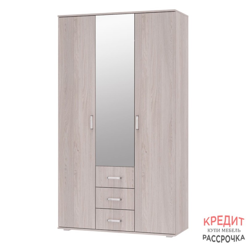 Трёхстворчатый шкаф "Белла" станет незаменимым помощником в хранении ваших вещей. Модель имеет отделение с хромированной штангой для одежды на вешалках, три выдвижных ящика, а также зону с полками. На центральный фасад прикреплено высокое зеркало.