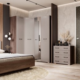 Спальный гарнитур «Моника» – это сочетание практичности и комфорта, эстетики и многофункциональности. В коллекции есть всё необходимое для обустройства современной спальной комнаты: широкая кровать и прикроватная тумба, шкафы, пенал, комод и косметический столик. Тренд этого года, разрушающий стереотип о высокой стоимости красивой стильной мебели – эффект эмалированных фасадов из МДФ цвета «топлёное молоко» в комбинации с корпусом темно-шоколадного оттенка под натуральное дерево «ясень тёмный». Светлая спальня – универсальное решение, визуально расширяющее пространство и сочетающееся со всеми современными стилями интерьера. Изысканность в простых деталях – прямые параллельные линии фрезеровки фасадов – делает модель максимально привлекательной и лаконичной. Оригинальное конструктивное решение – фасады закрывают торцы корпусов.