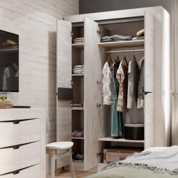 Трёхстворчатый распашной шкаф «Леонардо» с одной стороны имеет пять вместительных полок для белья, с другой стороны – удобную антресольную полку для хранения головных уборов, горизонтальную хромированную штангу для плечиков и нижнюю полку, в которой удобно хранить коробки с обувью. Особый шарм ему придаёт зеркало в полный рост, которое располагается на фасаде центральной створки.
