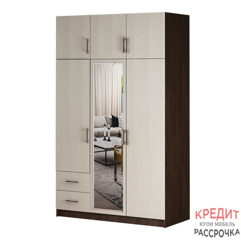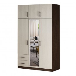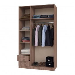 Очень вместительная модель трехстворчатого шкафа с ящиками будет прекрасно смотреться в вашей спальне. Изделие состоит из нескольких зон для хранения одежды и обуви, включая два выдвижных ящика для мелких вещей, отделение для одежды на вешалках и вместительные полки. В центральную створку вставлено зеркало, что помимо основной функции, позволяет визуально расширить пространство. Сборка не универсальная.