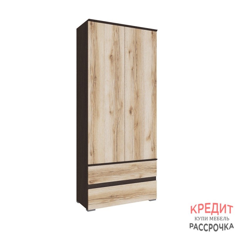 В поисках внместительного шкафа со стандартными габаритами рекомендуем присмотреться к модели из серии Плейона. Двухстворчатый шкаф оснащен выдвижной евроштангой, комплектом полок и двумя выдвижными ящиками.