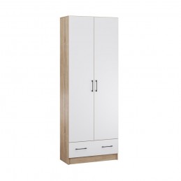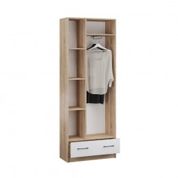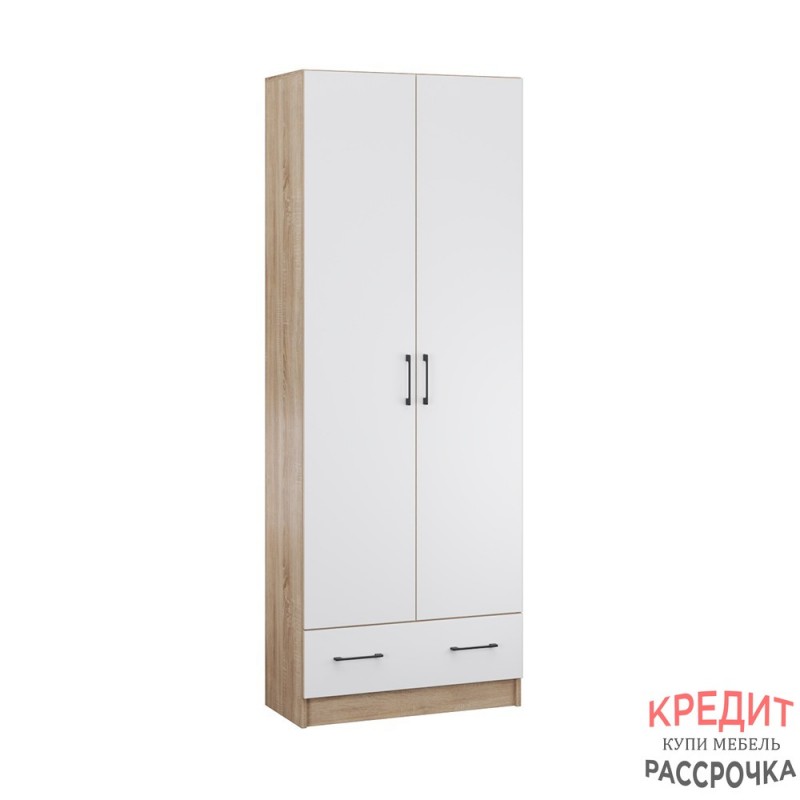 Двустворчатый шкаф для одежды Денвер - отличный вариантдля организации хранения в малогабаритной прихожей. Имеет набор полок, штангу и ящик. Всего одного такого шкафа достаточно, чтобы разместить во входной зоне все вещи: от верхней одежды до вещей в сложенном виде, сезонных аксессуаров и обуви. Характеристики: Цвет: Дуб сонома/Белый с тиснением древесные опоры Материал: ЛДСП Особенности: современный стиль хорошая вместимость разноплановое наполнение черные металлические ручки возможность установки в малогабаритном помещении