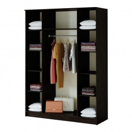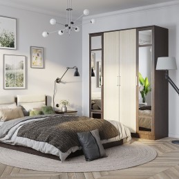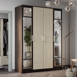 Разместить большой гардероб вы сможете благодаря четырёхстворчетому шкафу "Фиеста". Модель выполнена из ЛДСП в комбинации цветов "венге" и "лоредо", две створки являются зеркальными. Шкаф состоит из большого центрального отделения со штангой для верхней одежды и вещей на вешалках. Справа и слева от платяной зоны находятся полки. Фасады оснащены эргономичными ручками.