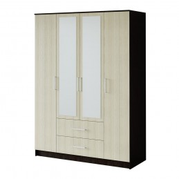 Вместительный четырёхстворчатый шкаф "Фиеста" справится с большим гардеробом и другими вещами. Модель выполнена из качественной ЛДСП. Корпус сделан в темном цвете "венге", а фасады – в светлом "лоредо". Комплектация представляет собой центральную зону с двумя нижними выкатными ящиками и отделения со штангой для одежды на плечиках. Справа и слева расположились многочисленные полки для вещей. В створки центральных дверок вмонтированы зеркала.