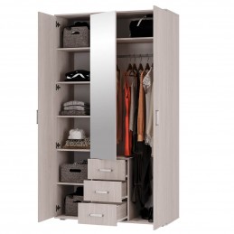 Трёхстворчатый шкаф "Белла" станет незаменимым помощником в хранении ваших вещей. Модель имеет отделение с хромированной штангой для одежды на вешалках, три выдвижных ящика, а также зону с полками. На центральный фасад прикреплено высокое зеркало.