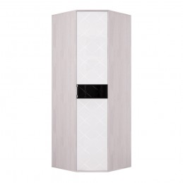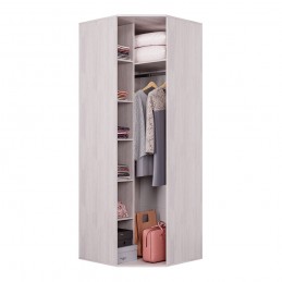 Красивая модель углового шкафа "Кимберли" выполнена из светлой ЛДСП цвета "ясень белый". Фасад распашной дверцы сделан в стиле всей одноимённой коллекции и имеет декоративный фацет и гравировку. Внутри модель разделена на две зоны: для одежды на плечиках предусмотрена хромированная штага, а для других вещей – вместительные полки.