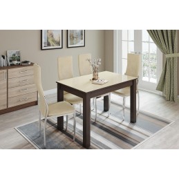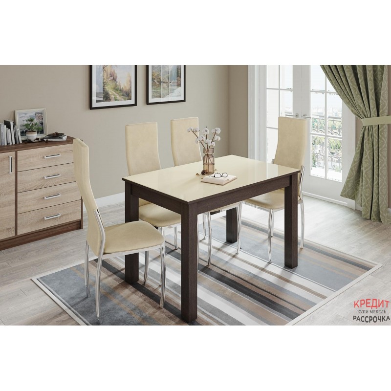 Обеденный стол Норман по достоинству оценят любители качественной и привлекательной мебели. Столешница изготовлена из ЛДСП и покрыта стеклом в декоре "лакобель ваниль". Имеет скругленные углы, что не только визуально привлекательно, но и безопасно для ежедневного использования. Опоры из МДФ облицованы высококлассной финиш-пленкой цвета "венге цаво". Сочетание светлой столешницы и темных ногвыглядит контрастно, но стильно. Особенности стеклянная столешница в декоре "лакобель ваниль" надежные ножки из МДФ с древесным декором стандартный размер для кухни нераскладная модель