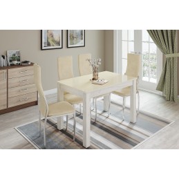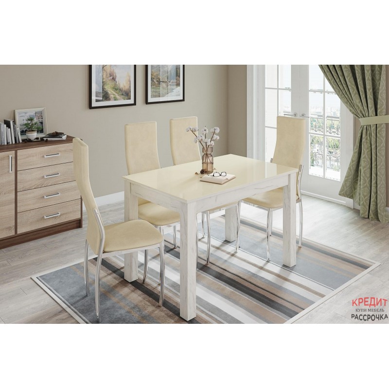 Обеденный стол Норман по достоинству оценят любители качественной и привлекательной мебели. Столешница изготовлена из ЛДСП и покрыта стеклом в декоре "лакобель ваниль". Имеет скругленные углы, что не только визуально привлекательно, но и безопасно для ежедневного использования. Опоры из МДФ облицованы высококлассной финиш-пленкой цвета "дуб крафт белый". Цвет стола визуально освежит интерьер Вашей кухни и будет гармонировать с мебельным гарнитуром. Особенности стеклянная столешница в декоре "лакобель ваниль" надежные ножки из МДФ с древесным декором стандартный размер для кухни нераскладная модель