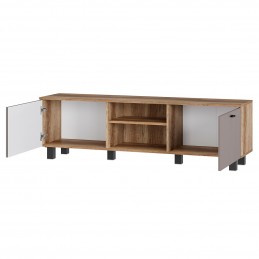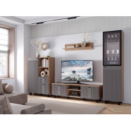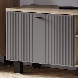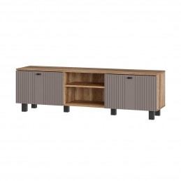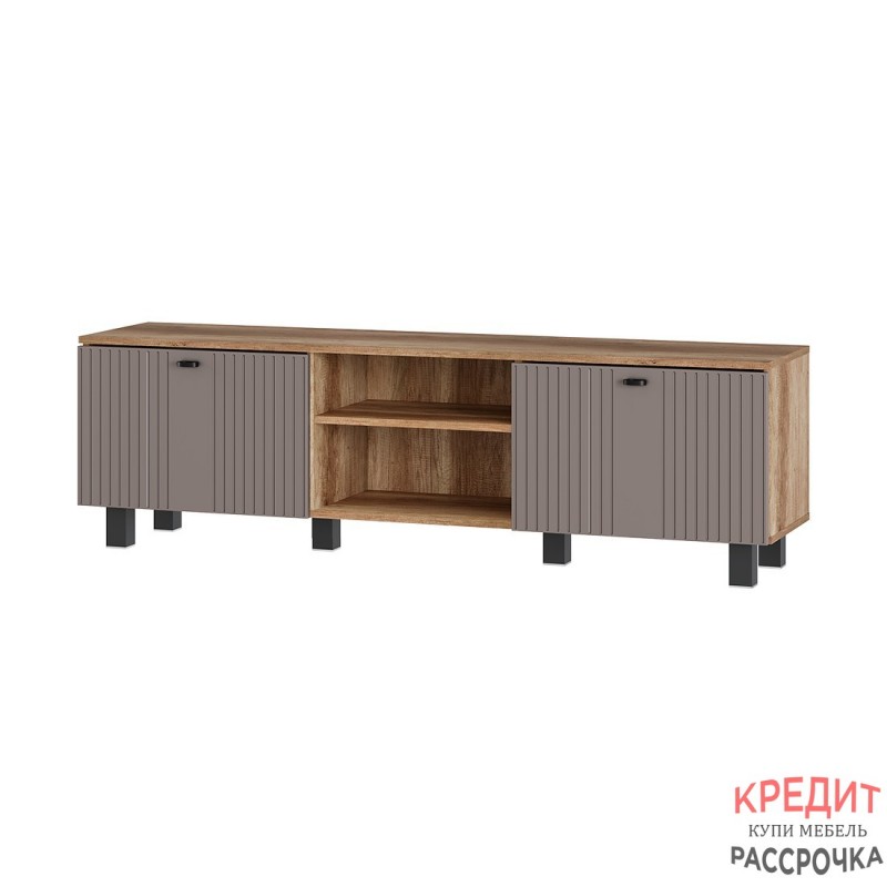 Тумба под ТВ "Олива" выполнена из качественной ЛДСП в цвете "дуб каньон", а фасады отделаны МДФ цвета "муссон софт". На столешнице тумбы поместится телевизор практически любого размера, а в нишах можно хранить необходимую технику.
