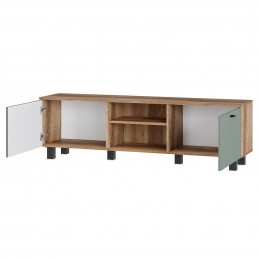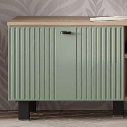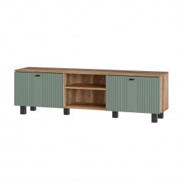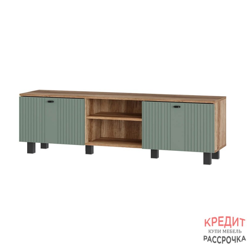 Тумба под ТВ "Олива" выполнена из качественной ЛДСП в цвете "дуб каньон", а фасады отделаны МДФ цвета "эвкалипт". На столешнице тумбы поместится телевизор практически любого размера, а в нишах можно хранить необходимую технику.