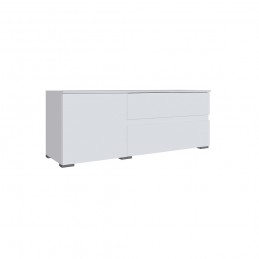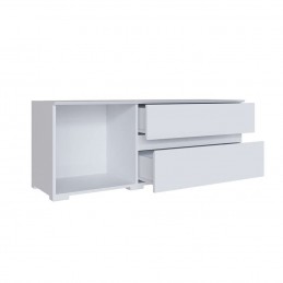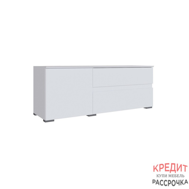 Компактная ТВ-тумба для гостиной с современным интерьером. Имеет закрытую створкой нишу и два выдвижных ящика. Лицевая фурнитура отсутствует: фасады открываются за скос.