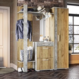 Благодаря Прихожей "Кензо" можно организовать удобную и продуманную систему хранения даже в небольшом помещении. На открытой панели со штангой, крючками и полками найдется место для верхней одежды, сумок, шарфов и зонтов. Для обуви предусмотрены выдвижные ящики. Ключи и прочие мелочи удобно держать на небольшом столике выше. Поправить прическу, головной убор или одежду можно благодаря навесному зеркалу, которое, к тому же, визуально расширяет пространство.